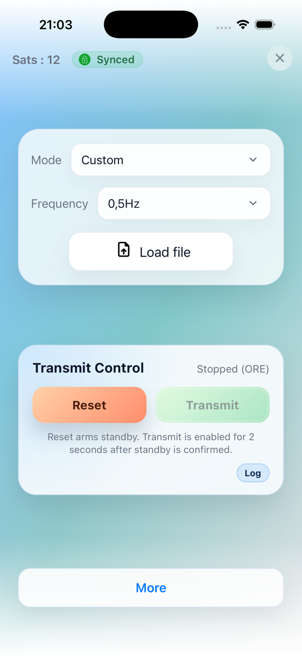 The main page shows GPS status, sync status, mode, and frequency. It also provides transmit control and the TX log.